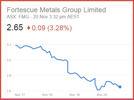 On top of the iron ore price falling, the Australian stock market has fallen by 2.5 percent over the last three days. This is a huge three day fall. Why it is not making headline news I don't know. FMG stock has fallen just over 17 percent since Monday. A stock like FMG falling by 17 percent in four days would normally be top of the news.