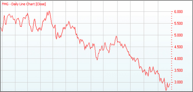 Fortescue Metals (FMG) have been hit a bit harder losing around $2.25 or 42.5 percent. This is due to the view that the cost to FMG of getting the iron ore out of the ground and on the ships is around the $70 per tonne mark, whereas at around $50 per tonne Rio and BHP have more room to move.