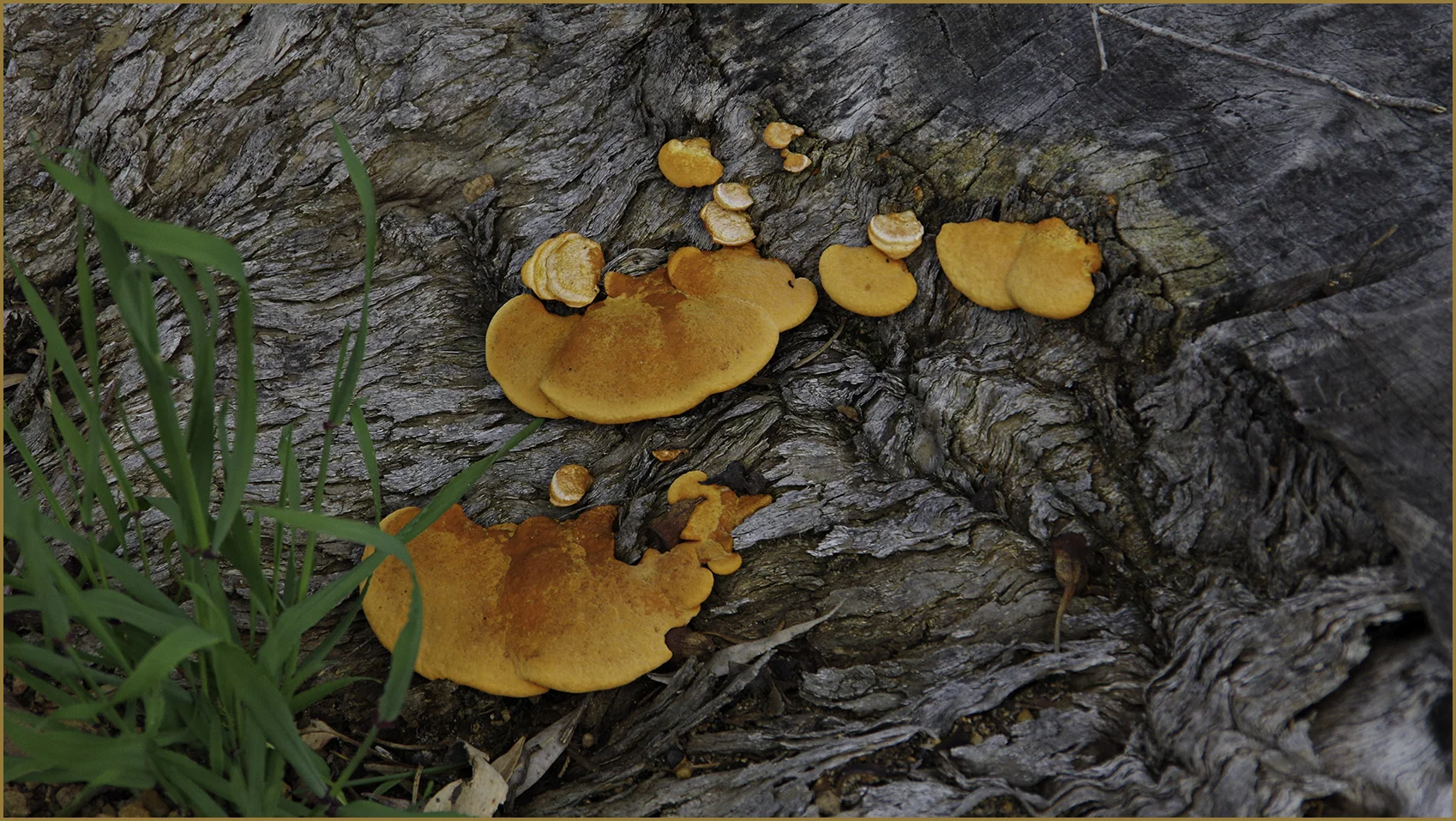 I walked into the undergrowth about five meters and spotted this bright orange fungus thriving on the side of a dead fallen tree.