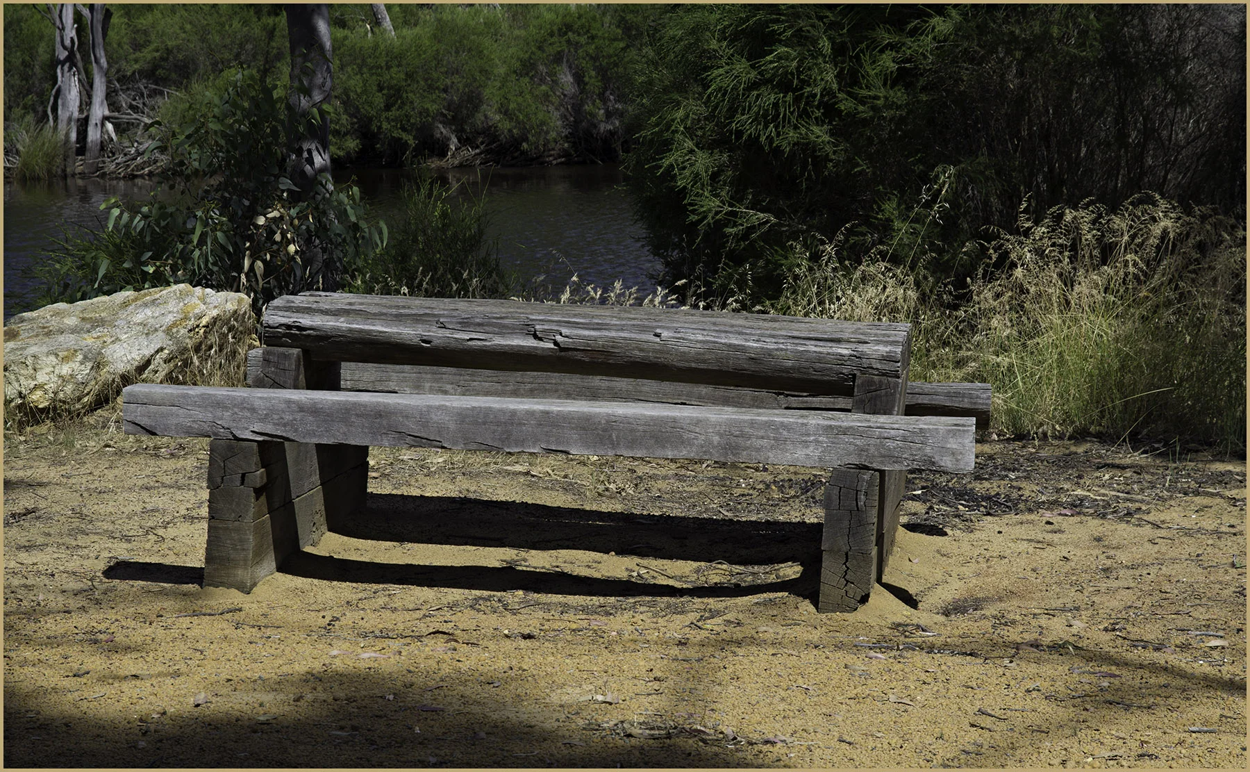 I really like this picture for a number of reasons. I like the typical brown gravel 'finish' on the ground that just about all West Australian camping grounds have. I like that the ground has sunk under the right-hand side of the bench so it slopes and that weather-worn grey looks that all wood gets when it is left out in the Australian sun. I like the dying wild oats on the right of the picture and the large quartz rock on the left—which may have well been left over from the digging of the dam.