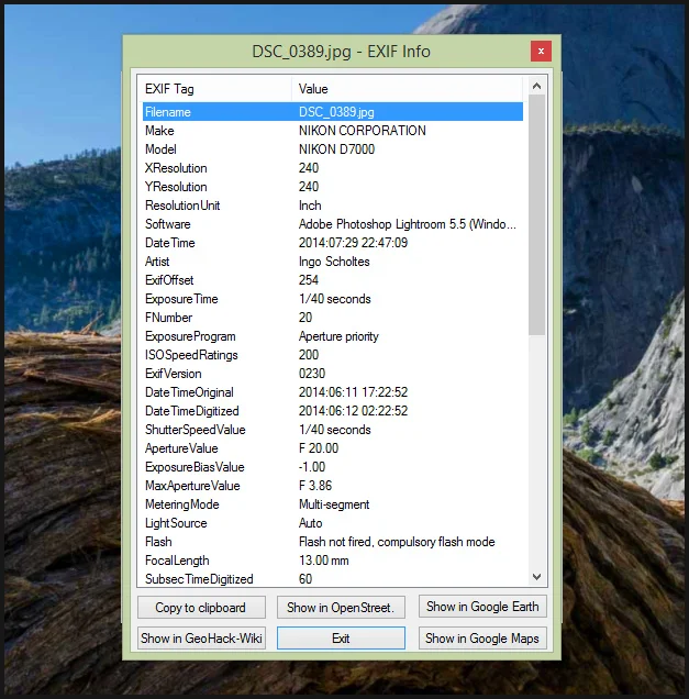 This picture was on Ingo's Web site and after I downloaded it I was able to find out some useful information from the EXIF information embedded in the picture's data.