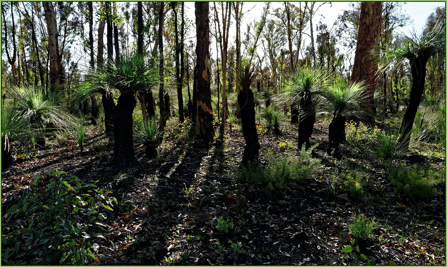 With the sun still low in the sky you get these long shadows from the grass trees (a.k.a. blackboys) look really good (well, I think to anyway) and the sun coming through the tops of the grass trees makes the green foliage sort of glow a bit.