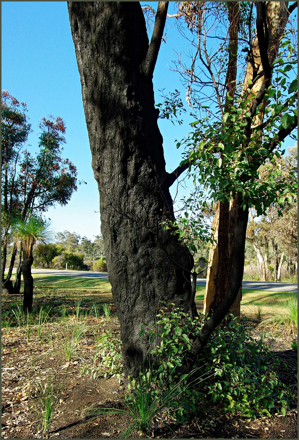 I like effect of the sun shining directly on the burnt part of the tree and silky shine that it gives it. Pity about the bitumen road in the background—such is the life of a photographer.
