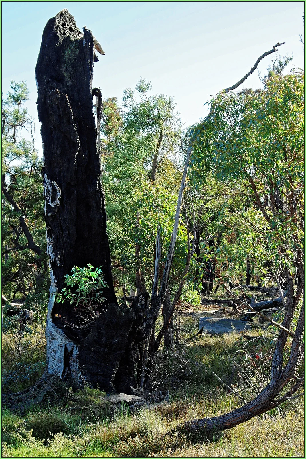 I was tempted to crop this shot down to just just the burnt tree and the seedling, but in the end I decided to leave it as I took it (as I often do) with the other trees in the shot.
