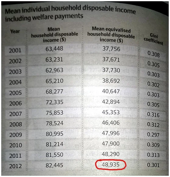 The HILDA chart published in the AFR also shows what is called the 'equivalised' amount—I think they made that word up because it is not in 21st Century Chambers. However it seems the 'equivalised' amount is each adult member's share of the household disposable income. As you can see from the chart, which I have included below (copyright alarm goes off … hopefully they won't sue), all us adult members of these households have almost $50,000 per year we can splurge on stuff.