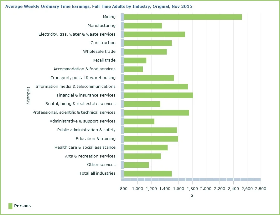 As you can see, Mining was far and away the top payer in November 2015 where the average weekly wage for full time employment was $2,500 or about $130,000 per year before tax.