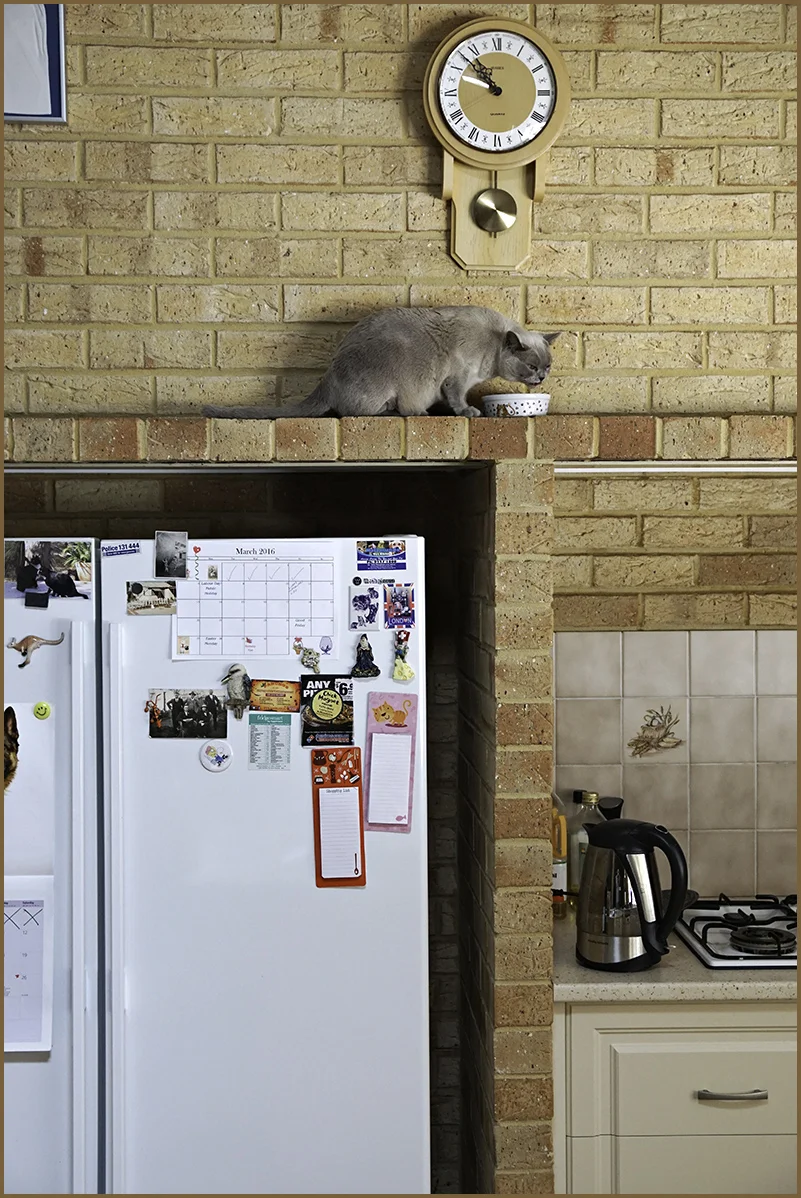 One of the locations we have found to put 'challenging' water for Sansa is up on the brick mantel above our fridge recess and hotplates. In order for her to get to this water she has to get up onto the nib wall at the left-hand side of the kitchen dresser. Then she needs to navigate along the dresser bench over all the crap and rubbish us humans put there, then get onto the top of the microwave, and then finally make the carefully calculated jump up onto the mantel which is only about 3" wide. Then walk along the mantel to the half-way point to where the special water is.