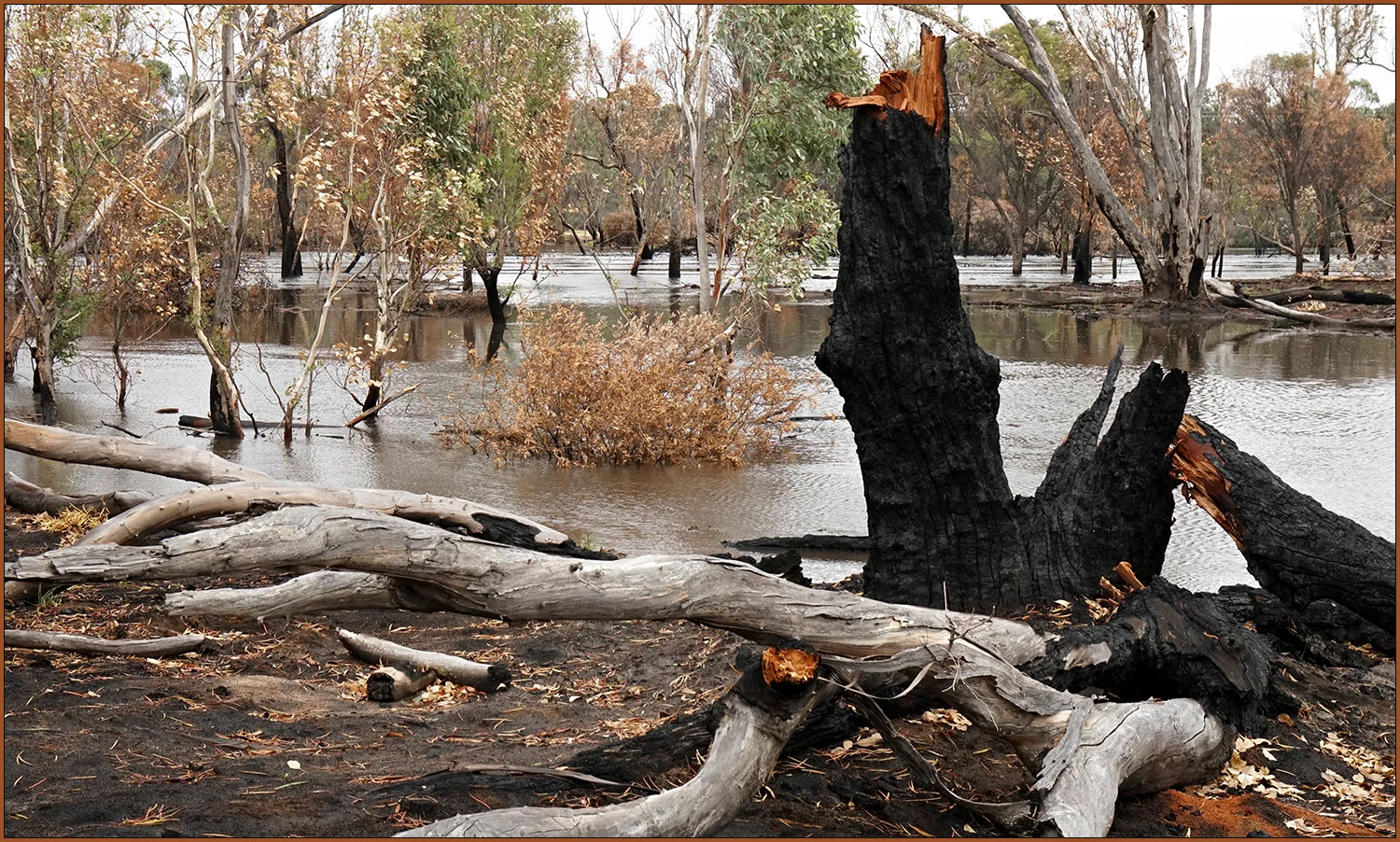 As you can see from the blackened trees and the new growth on the trees to the left, it was not that long ago earlier that summer that a bush fire went through here. And now its flooding!