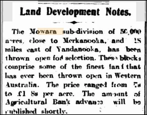 Back before about 1910 the localities of Morawa (or Mowara as I sometime see it written back then) and Merkanooka were blurred. Back then referring to Merkanooka one might be referring to where Mowara/Morowa was located and vice versa. Note the included clip (above) from the Geraldton Guardian 31/8/1910 which starts, “The Mowara sub-division of 50,000 acres close to Merkanooka, and 15 miles east of Yandanooka …”.