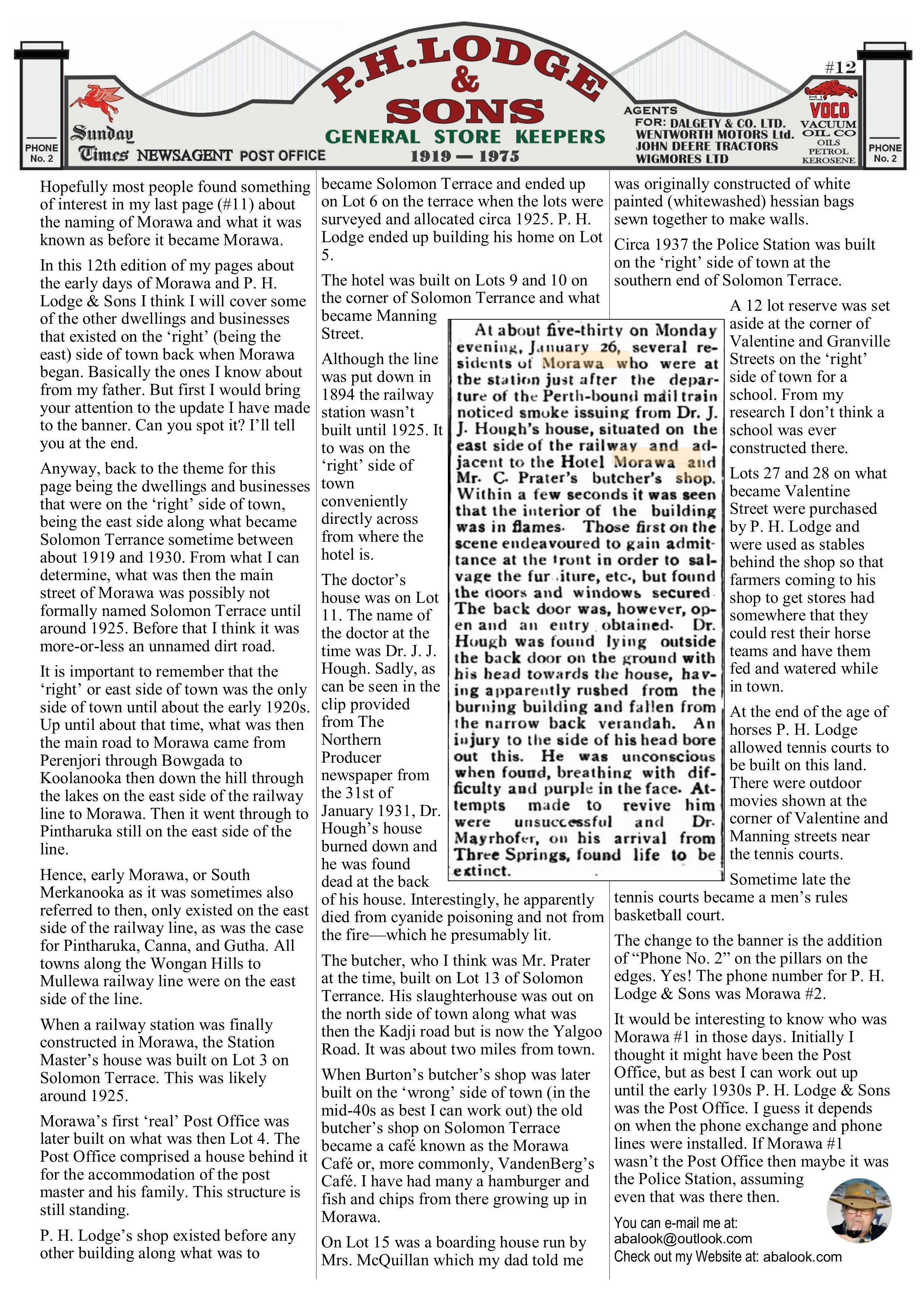 It would be interesting to know who was Morawa #1 in those days. Initially I thought it might have been the Post Office, but as best I can work out up until the early 1930s P. H. Lodge & Sons was the Post Office. I guess it depends on when the phone exchange and phone lines were installed. If Morawa #1 wasn’t the Post Office then maybe it was the Police Station, assuming even that was there then.