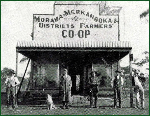 Page VI: Morawa’s first Co-op store the Morawa & Merkanooka Districts Farmers’ Co-op. Picture shows A. Granville, Mr. Tipping, Mr. Sasse, N Gill, Mr. Hepworth. Prior to being known as Morawa the township was often referred to as South Merkanooka.
